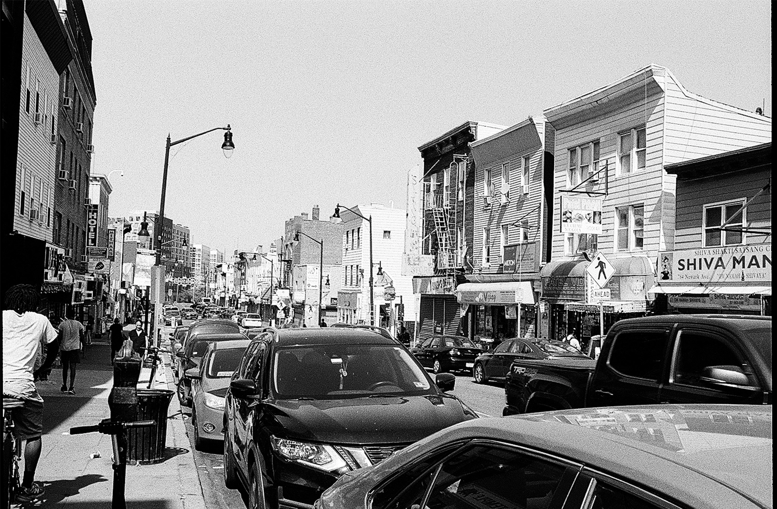 Restaurants serving masala dishes and cinnamon sweets line Newark Avenue.