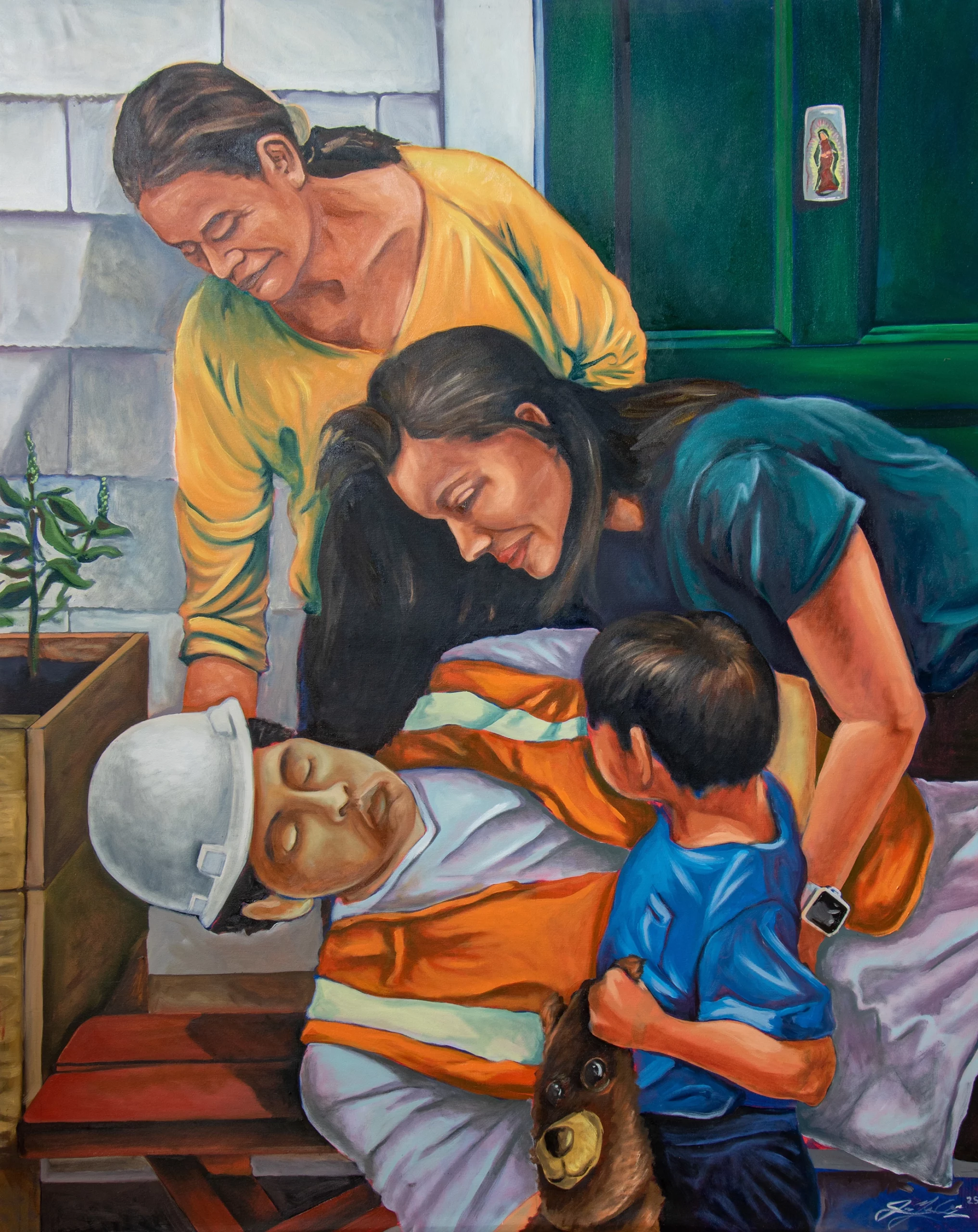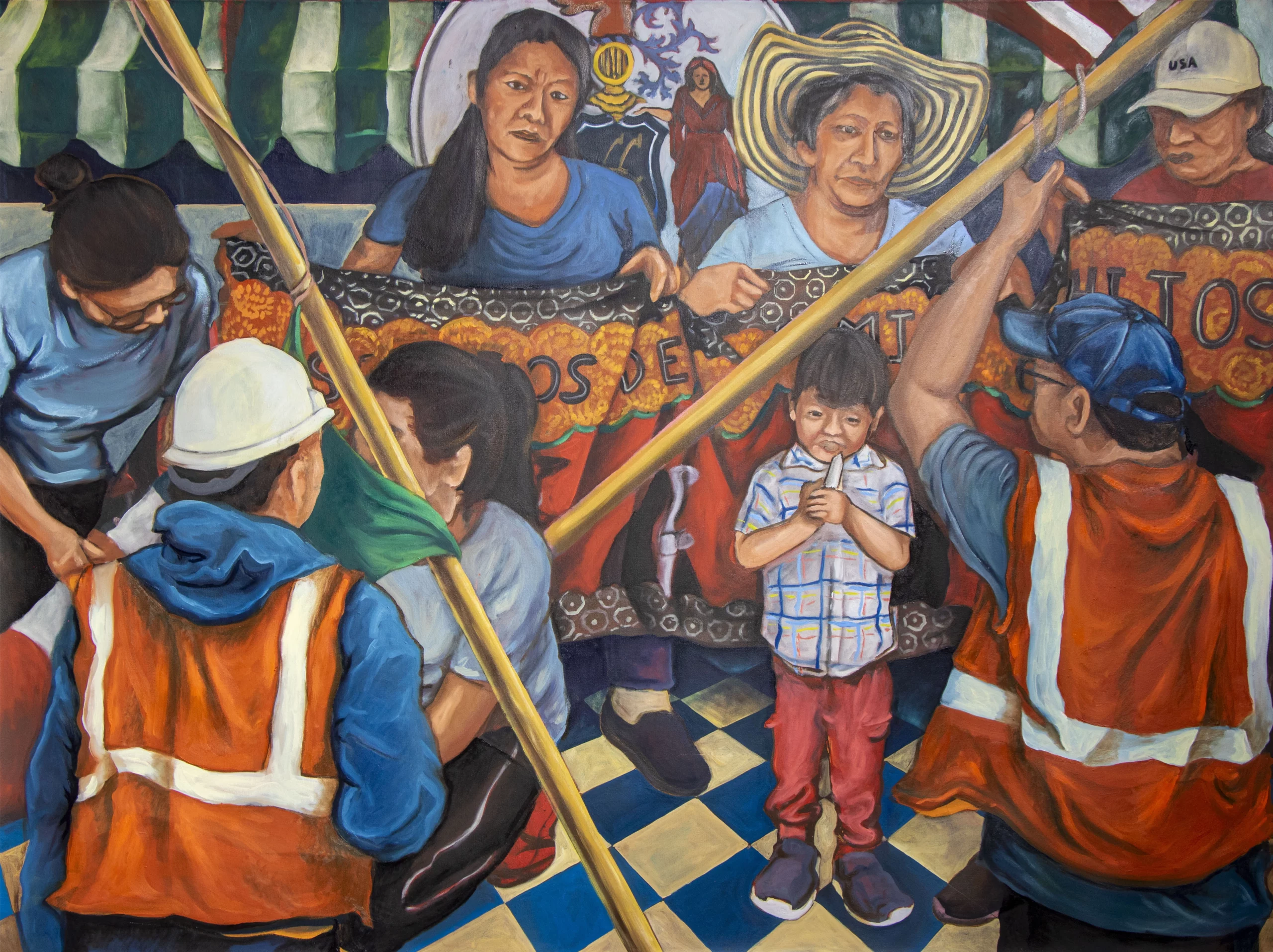 Drawn from the community dialogues hosted by CoLab Arts in New Brunswick, the painting centers on a recurring motivation voiced by immigrants: migration undertaken for the future of their children. A group of women holds a DÃa de los Muertos blanket brought from a participant’s home country, a symbol of continuity and remembrance. Before them, a young boy stands holding a candle, flanked by two construction workers turned away from the viewer and facing him.