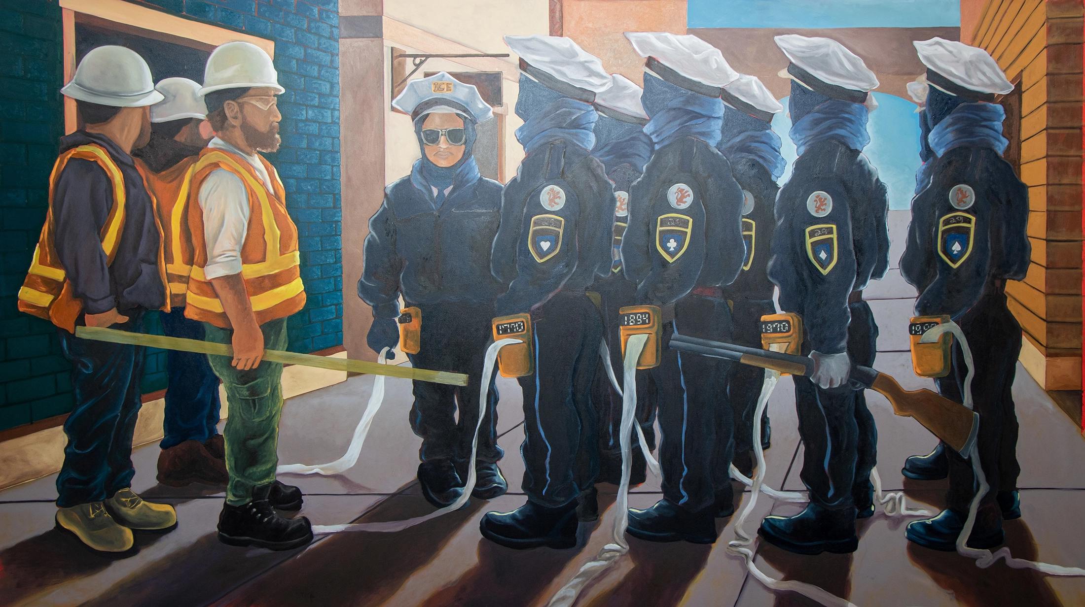 This painting revisits the confrontations between Bostonians and the 29th Regiment of Foot that culminated in the Boston Massacre. Drawing parallels across history, the work references the Pullman Strike of 1894, the Kent State shootings of 1970, and the 1992 Los Angeles Riots—each marking moments when state power was turned against the public. The composition extends this lineage to the present, reflecting on the current administration’s January 2025 directive removing restrictions on immigration enforcement.
