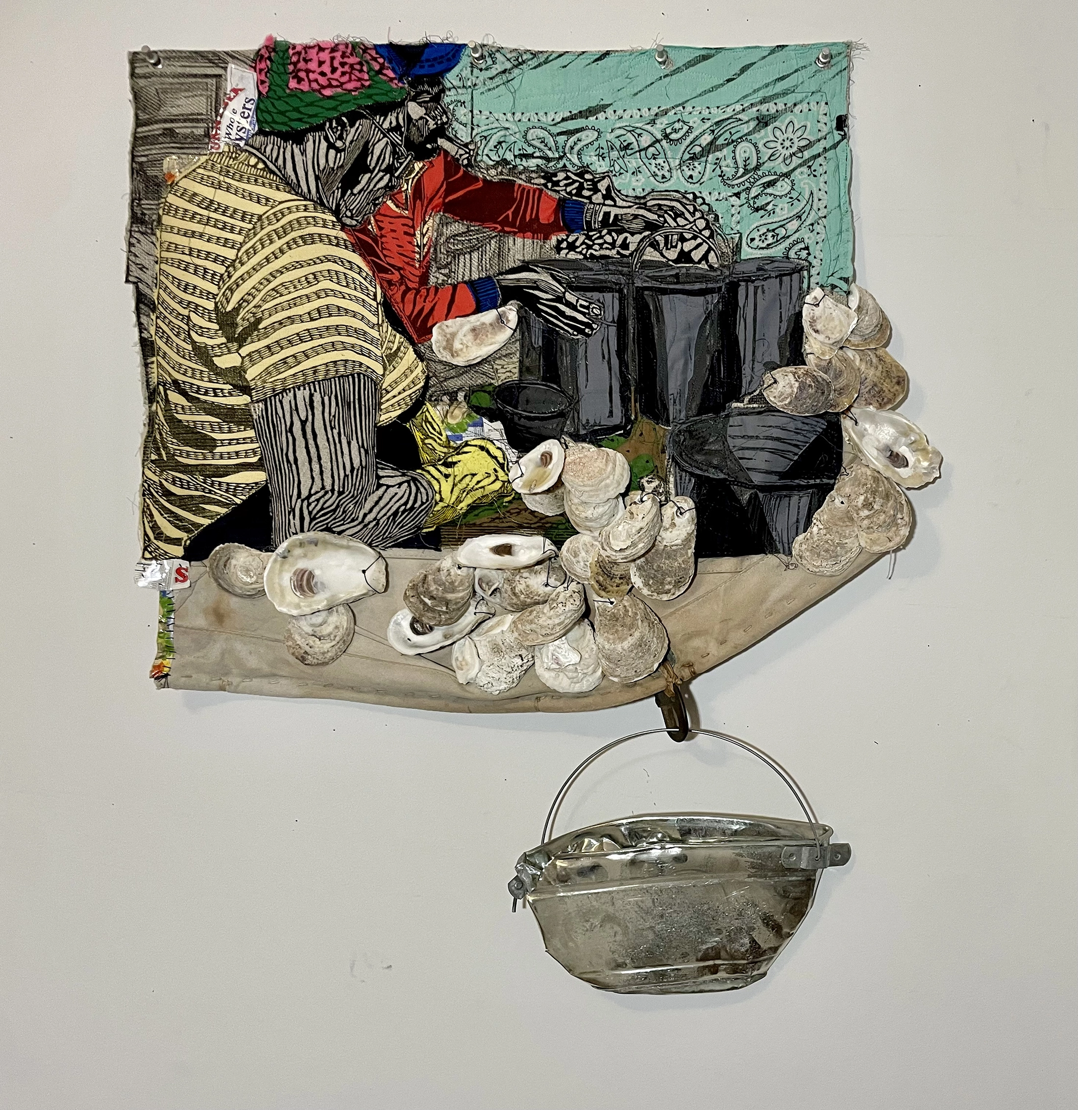 Material(s): Clothes from community event, scrap fabric, bucket, oyster packaging, sail and shells from Bayshore Center at Bivalve, relief print on upholstery fabric.