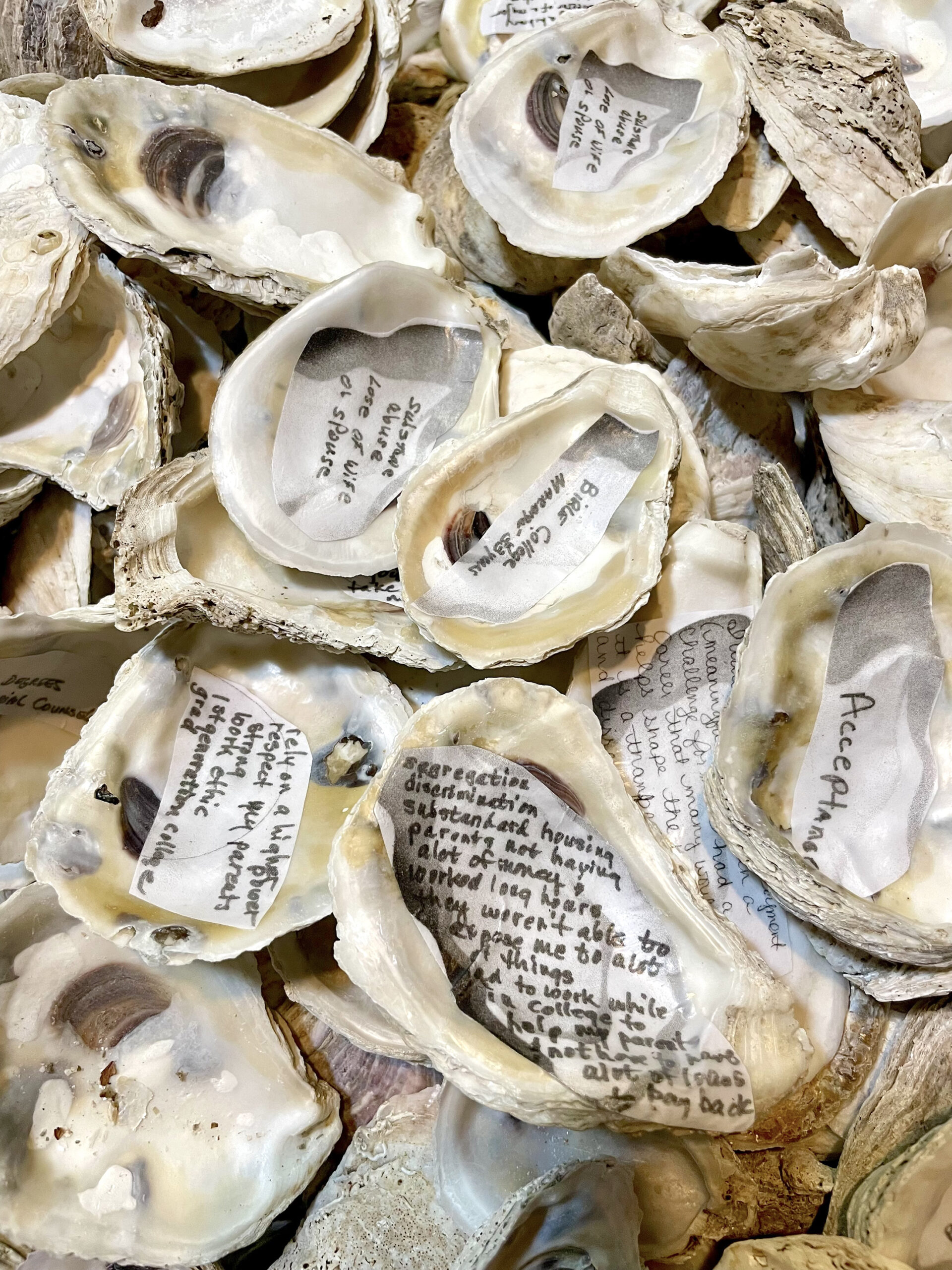 Lemonias’ art practice tells stories of labor, often unseen and untold. For NJMML, she created a tapestry and sculpture in response to the stories gathered from the community events. These pieces celebrate the history of Black migrants who seasonally shucked oysters in the Port Norris area. With an image reference from the Library of Congress, she constructed the tapestry using clothes collected from community events, scrap fabric, a bucket, oyster packaging, sail and shells from Bayshore Center at Bivalve. The sculpture uses a wheelbarrow often used to move the oysters, a sail and shells also from Bayshore Center at Bivalve that fills it.