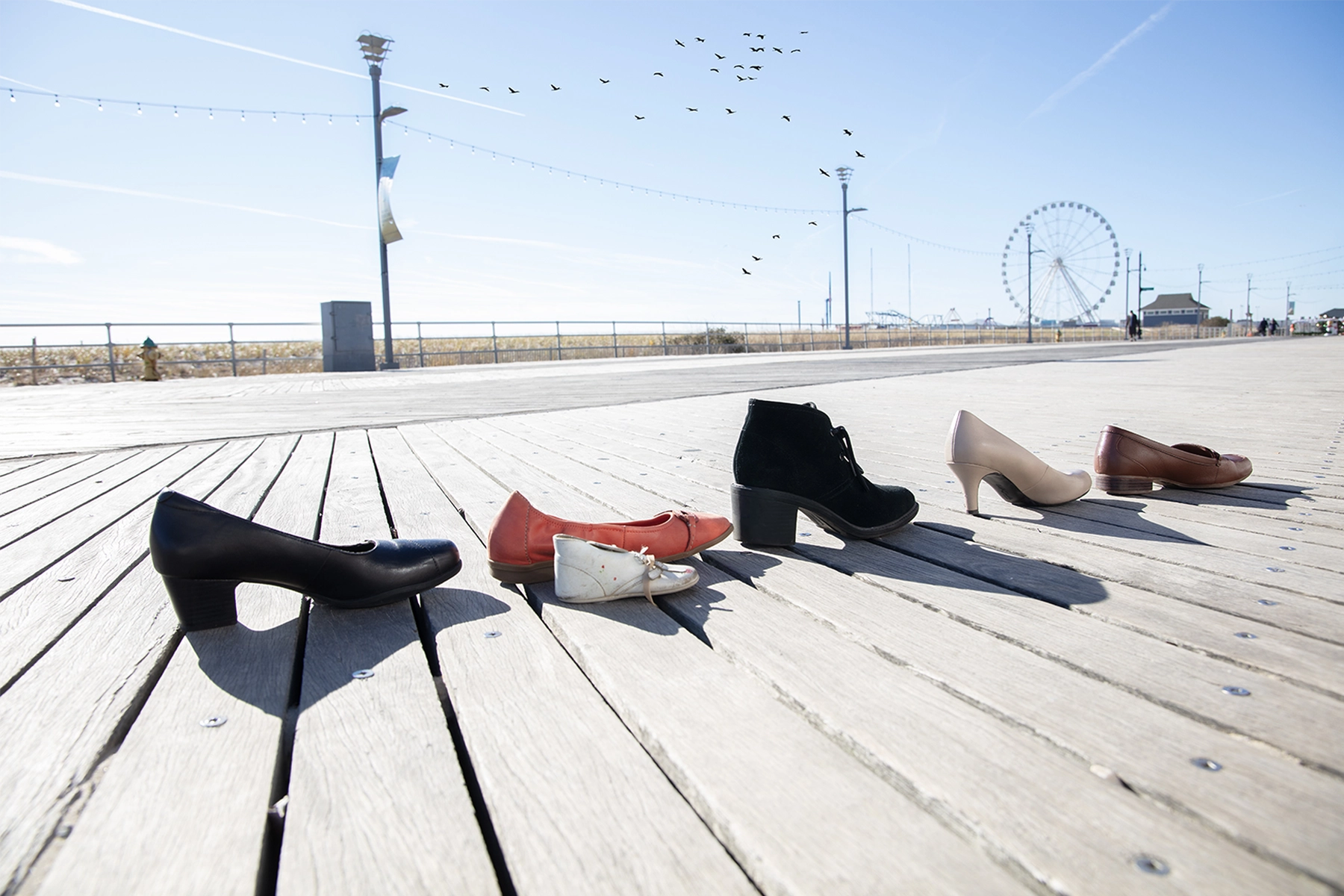 They moved to Atlantic City to find work, primarily at the casinos. The beaches and boardwalk were a main attraction for families. I decided to use shoes as a prop to represent people and families who traveled to Atlantic City for work and leisure purposes. Using the backdrop of the Steel Pier by the boardwalk helped frame that narrative.Â